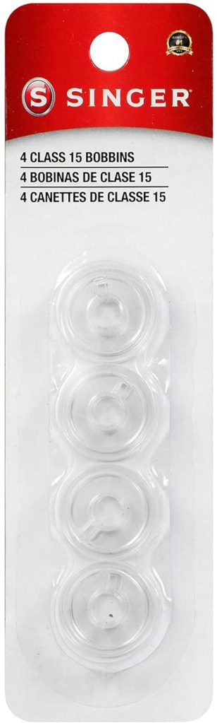 First, you will need at least one Class 15 bobbin, made for oscillating hook machines, and preferably one bobbin for each color of thread you plan to use. They are available at Amazon, Michaels, Joann, Hobby Lobby and Sewing Parts Online among others. You can use plastic or metal, it doesn’t really make much difference, and they aren’t dramatically different in price.